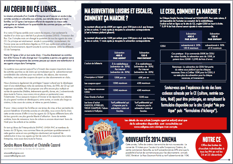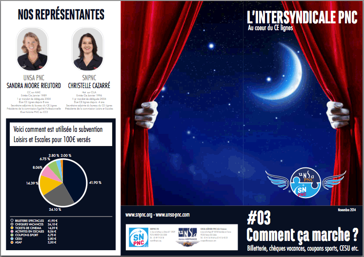 En tant qu’élues de l’Intersyndicale SNPNC- UNSA PNC et membres du bureau du CE lignes, nous sommes fières de participer quotidiennement à cette gestion saine et nous privilégions résolument cet impératif de redistribution à tous nos agents qui fait de notre CE un exemple dans notre Entreprise, mais aussi dans toute la France.