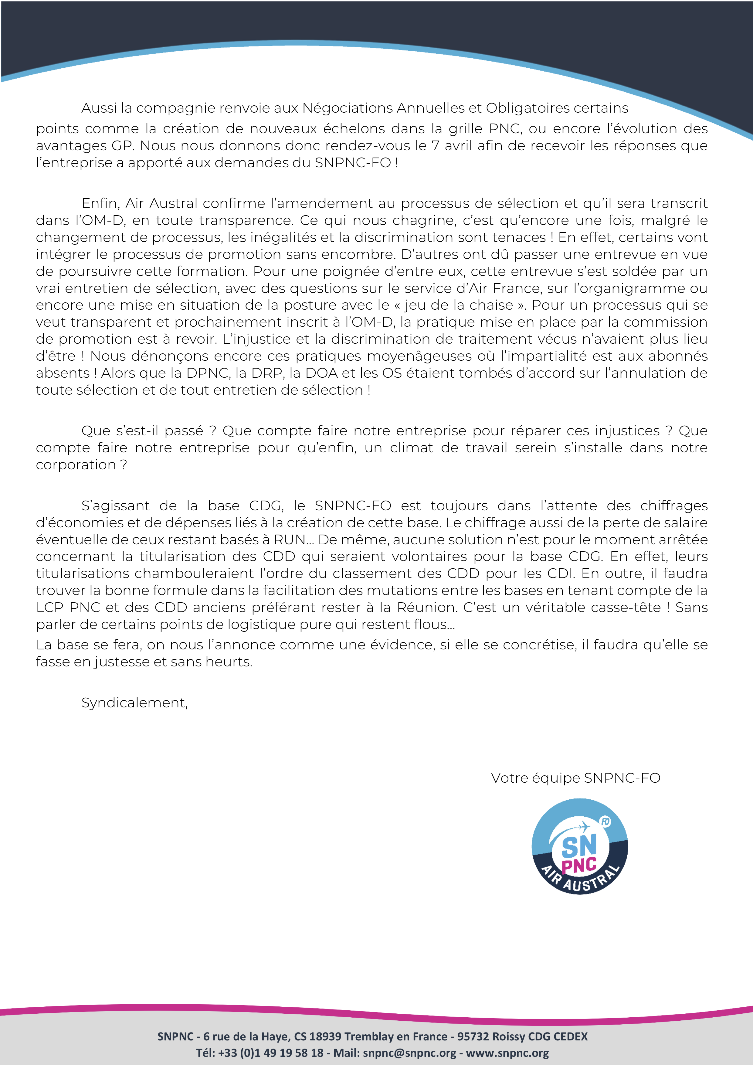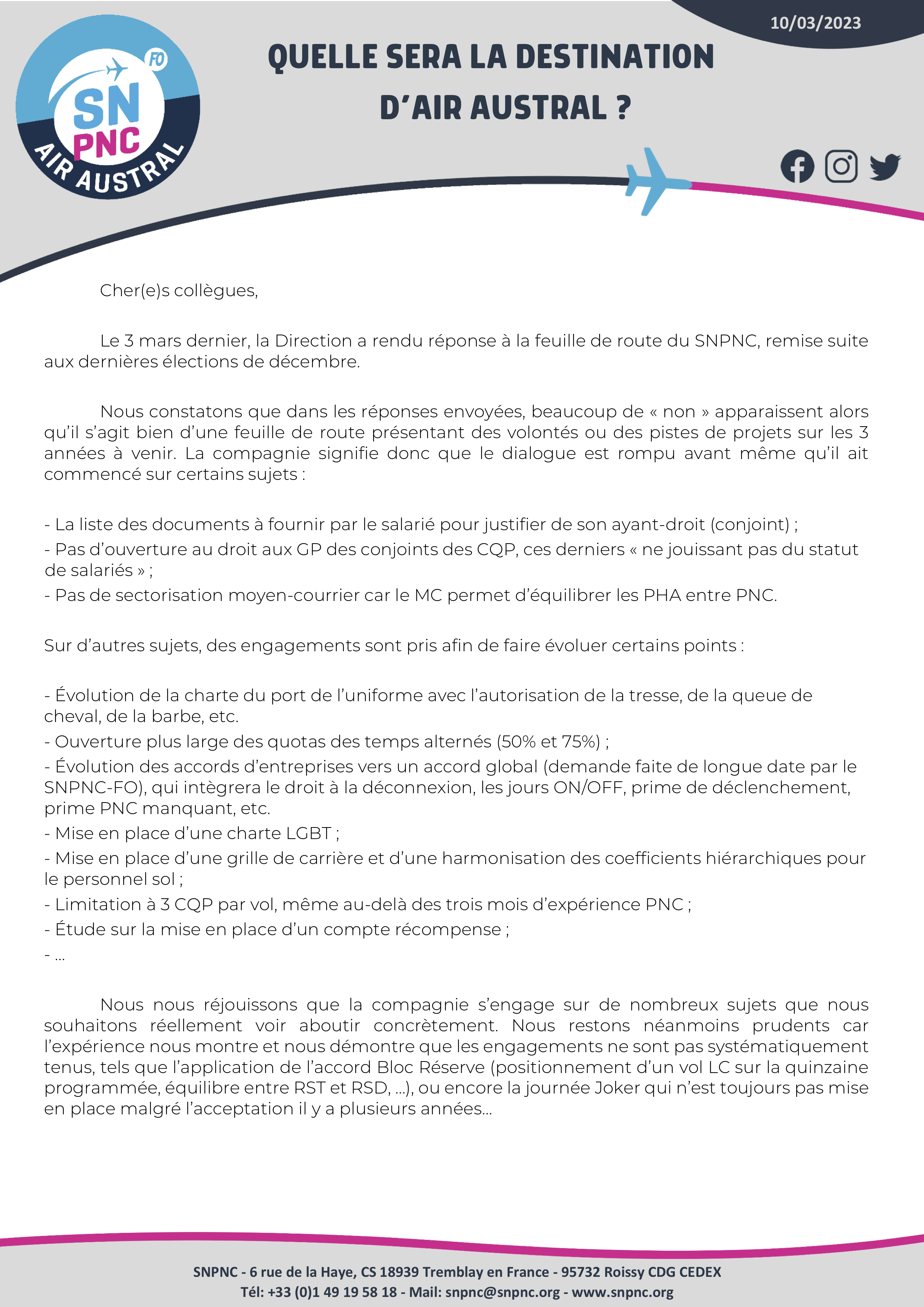 Le 3 mars dernier, la Direction a rendu réponse à la feuille de route du SNPNC, remise suite aux dernières élections de décembre.