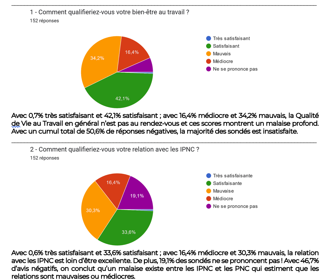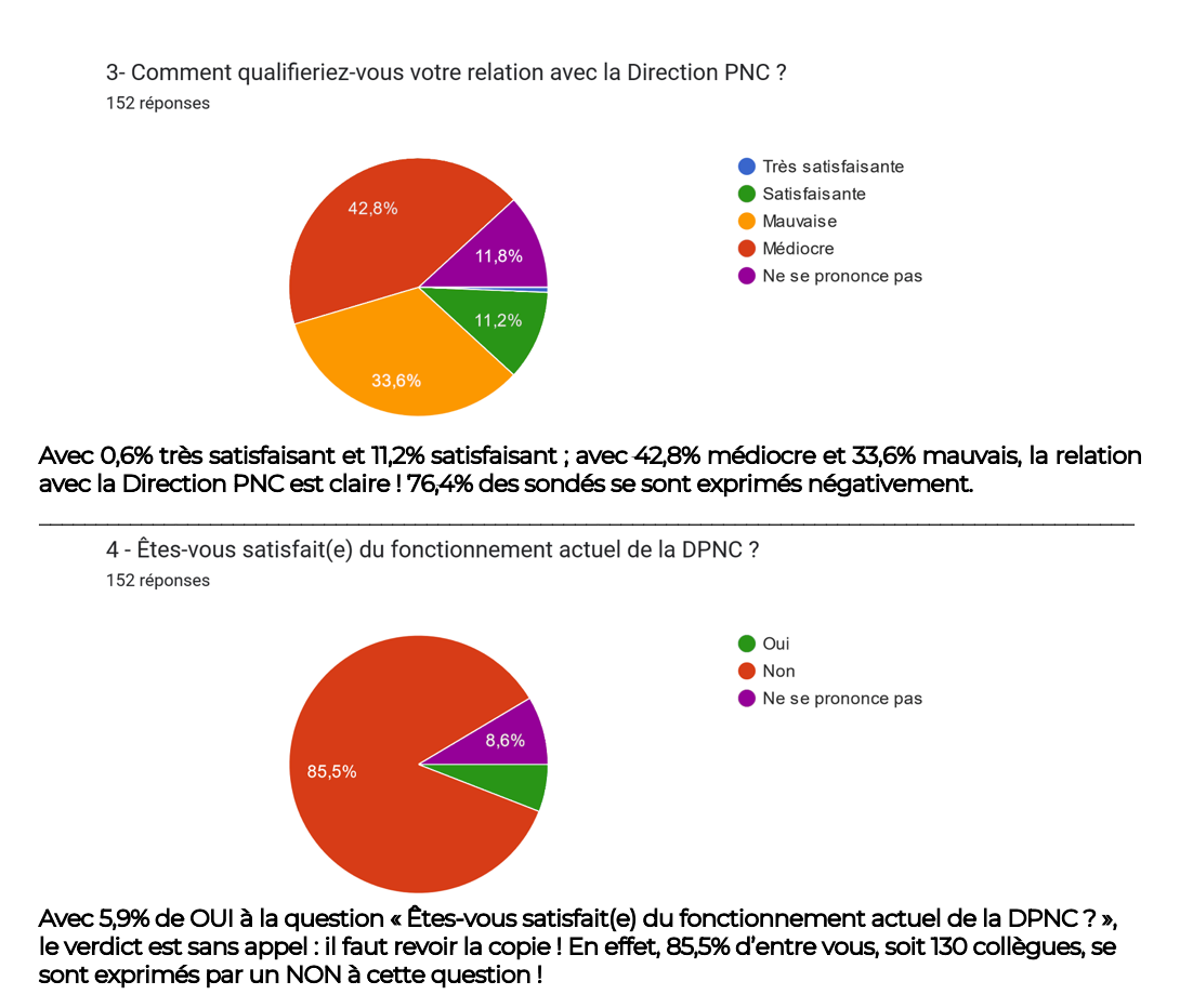 Sachez que le SNPNC-FO a déjà alerté à maintes reprises notre Direction qu’un mal-être gangrène la corporation PNC. L’entreprise, jusqu’à aujourd’hui, ne semble pas nous écouter et c’est bien pour cela que nous vous avons proposé ce sondage, pour vous laisser la parole. Il serait temps que les problématiques trouvent solutions, que le PNC soit considéré et reconnu.
