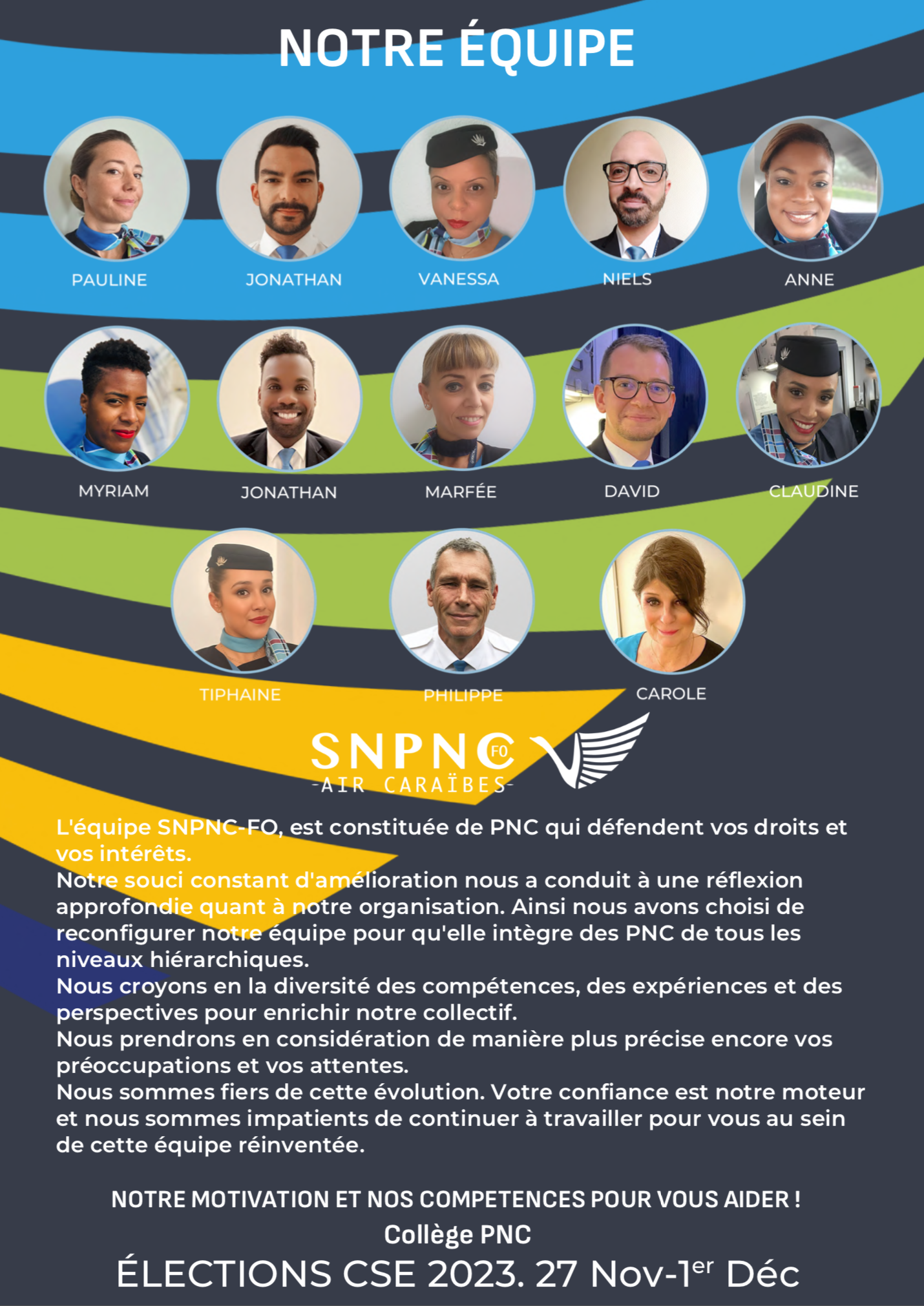 Myriam MOLA : Animée par une envie de faire avancer les choses et toujours prête à offrir une oreille attentive, je suis déterminée à défendre les intérêts de TOUS les PNC.