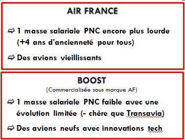 "BOOST", nouvelle compagnie dans le Groupe Air France, opérée par des PNT avec des contrats et une rémunération Air France, des avions neufs économes en carburant A350, 20 à 25 PS support (direction) et des PNC avec des contrats extérieurs "affrétés" par Air France, comme on a pu le lire dans le projet d'accord PNT.