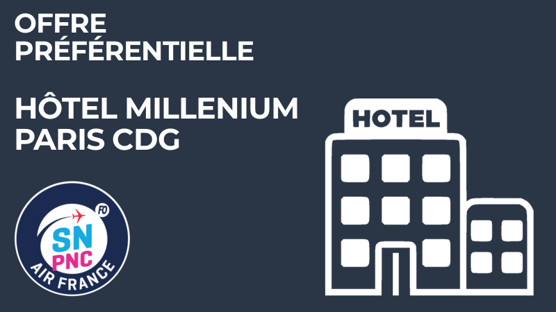 Nous sommes heureux de vous annoncer que vos délégués SNPNC ont réussi à négocier un tarif préférentiel avec l’hôtel MILLENIUM PARIS CDG (2 allée du Verger Roissy en France) pour une durée de 2 ans jusqu’à fin 2024. A partir du 25 Juin 2023, 20 chambres seront contingentées pour les PNC AF toute l’année.