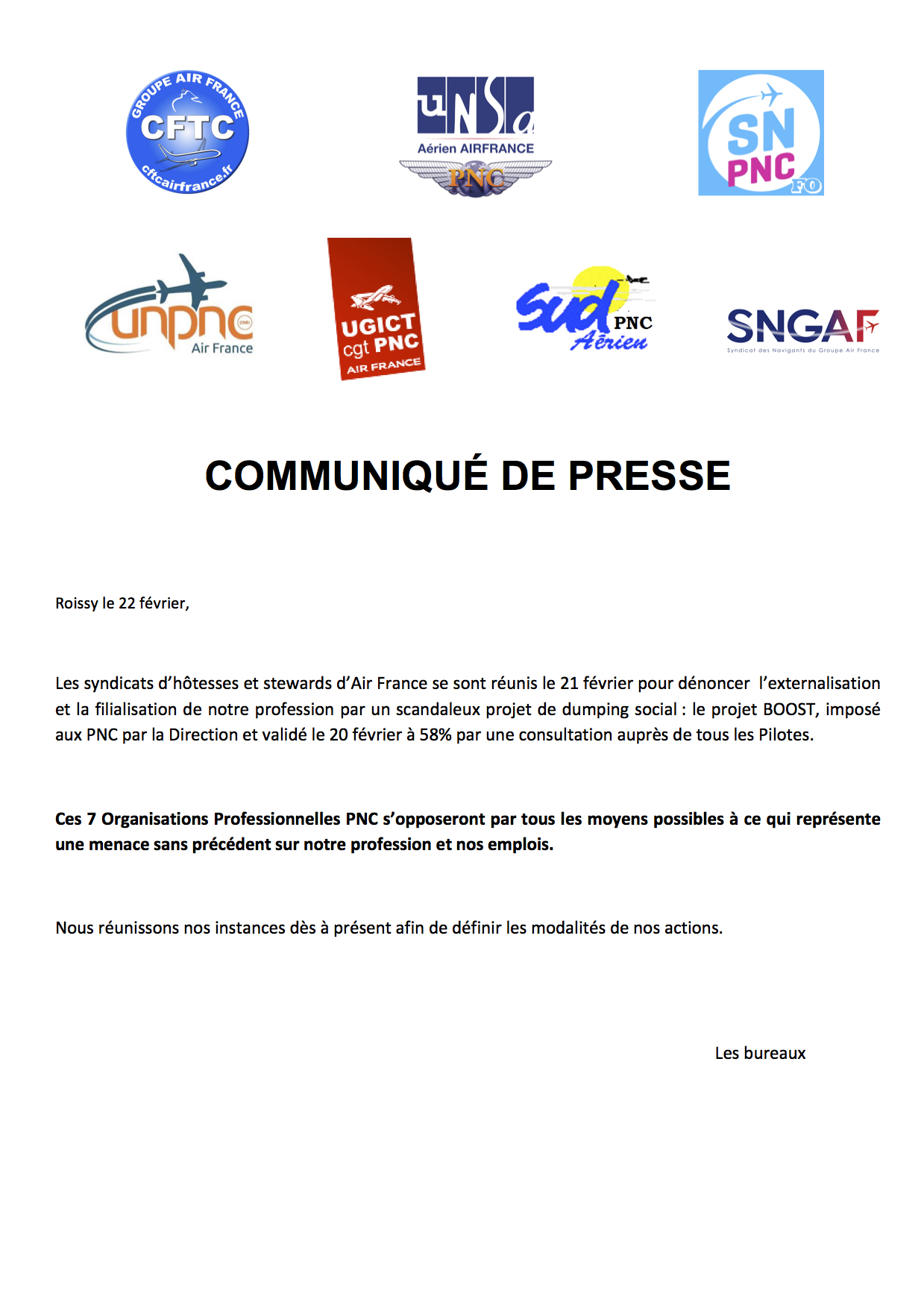 Communiqué de presse syndicats PNC d'Air France