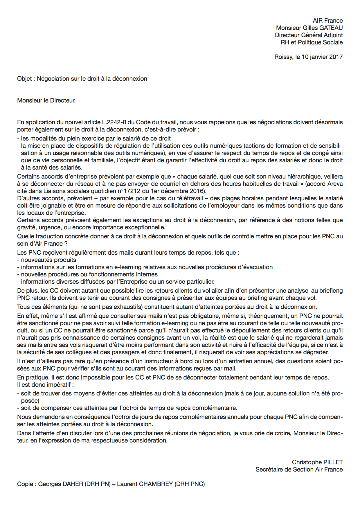 Le SNPNC, (voir courrier ci-joint) demande à la Direction, conformément à l’évolution de la loi, d’ouvrir des négociations sur le droit à la Déconnexion appliquée aux PNC.