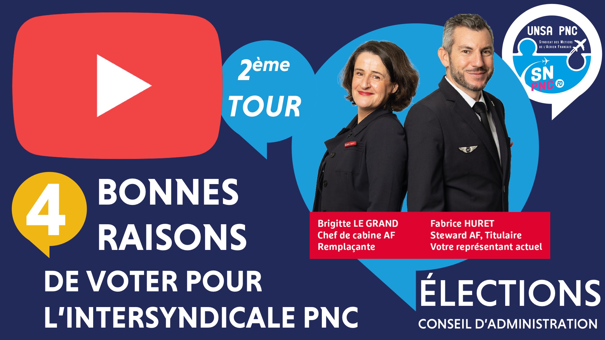VIDÉO : 4 bonnes raisons de voter pour L'INTERSYNDICALE PNC. PNC AF, HOP et TO, nous comptons sur vous pour confirmer la 1ère place de l’IS PNC lors de ce 2ème tour.