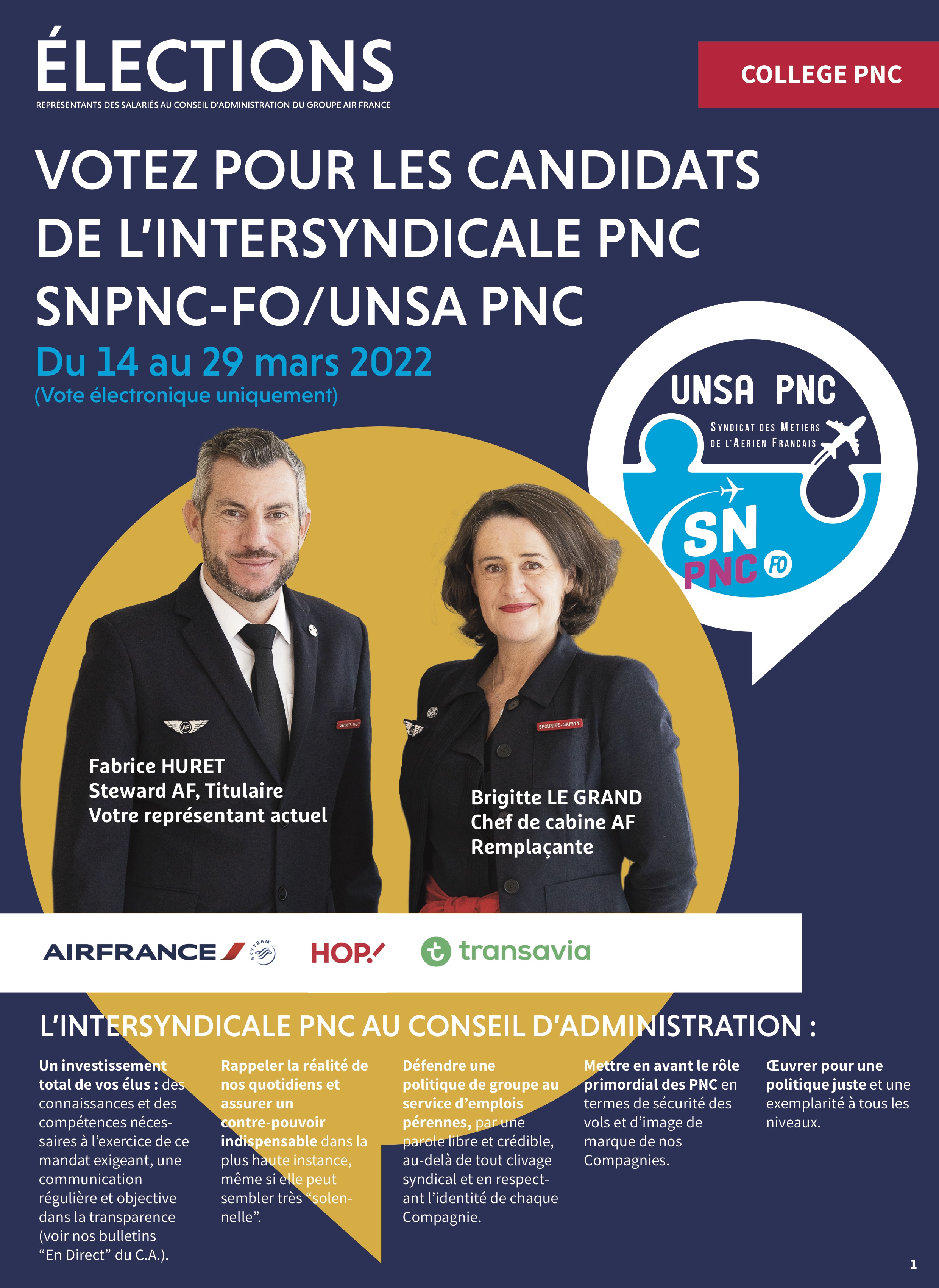 DU 14 AU 29 MARS, VOTEZ ET FAITES VOTER pour les candidats de L’INTERSYNDICALE PNC formée par le SNPNC-FO et L’UNSA PNC.