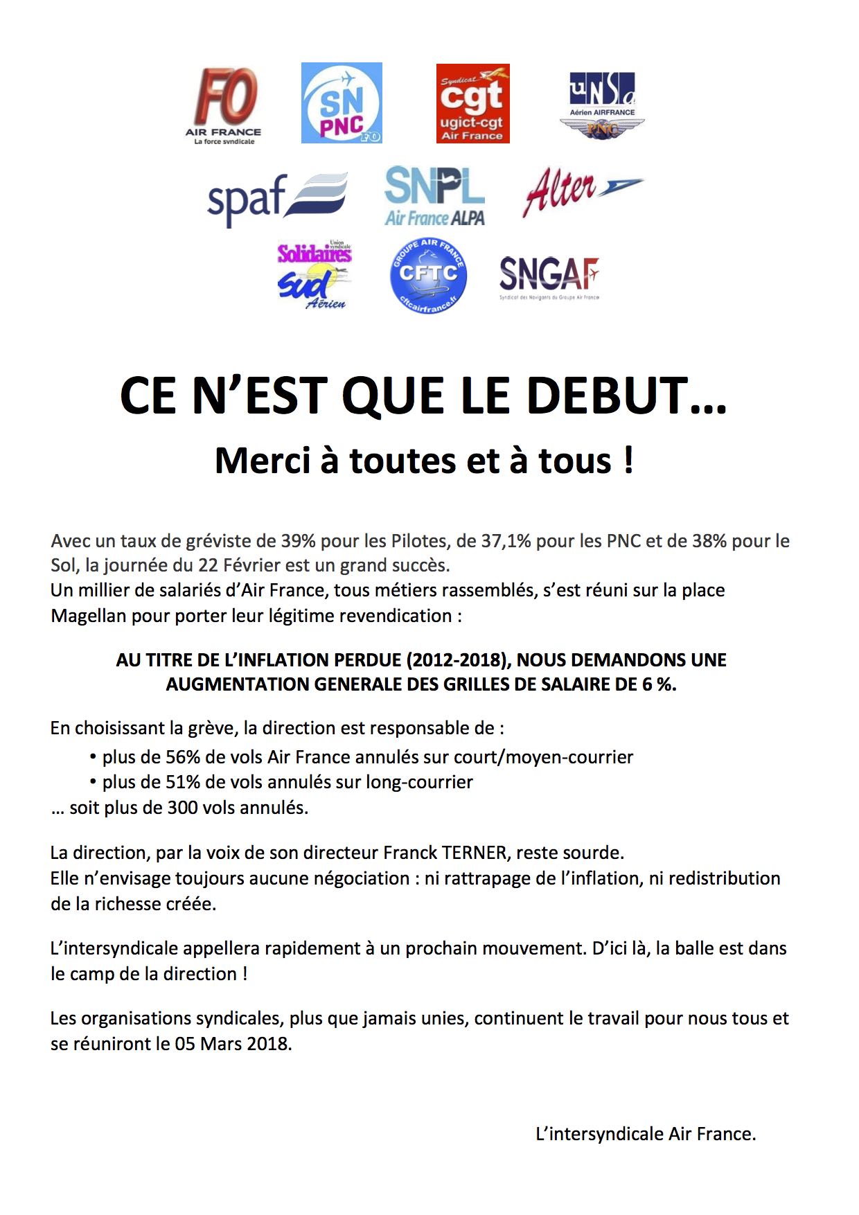 Avec un taux de gréviste de 39% pour les Pilotes, de 37,1% pour les PNC et de 38% pour le Sol, la journée du 22 Février est un grand succès.