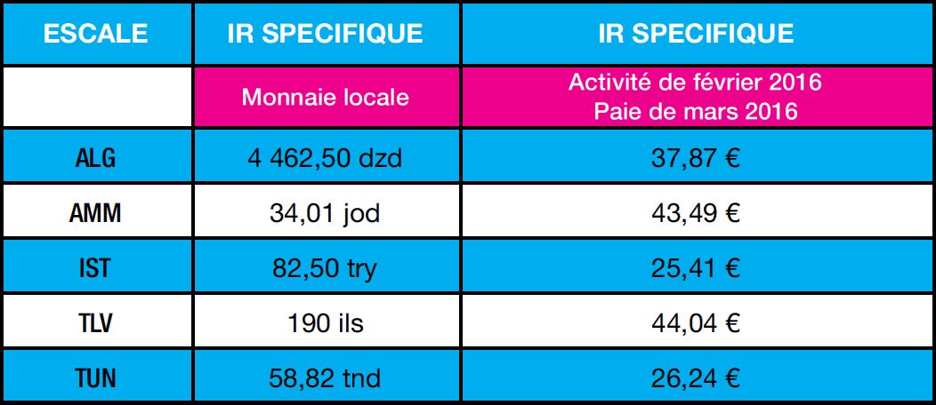Lors du délogement temporaire à l’hôtel Sheraton de TLV du 23 novembre au 16 décembre 2015 un écart de prix conséquent a été observé sur la restauration. L’IR attribuée pour TLV ne couvrait pas le montant à dépenser par les PNC pour pouvoir se restaurer dans l’enceinte de l’hôtel (escale sous prescription). Sur cette même période, l’IR a été réévaluée à 255 ILS et la régularisation est intervenue sur la paie de janvier.