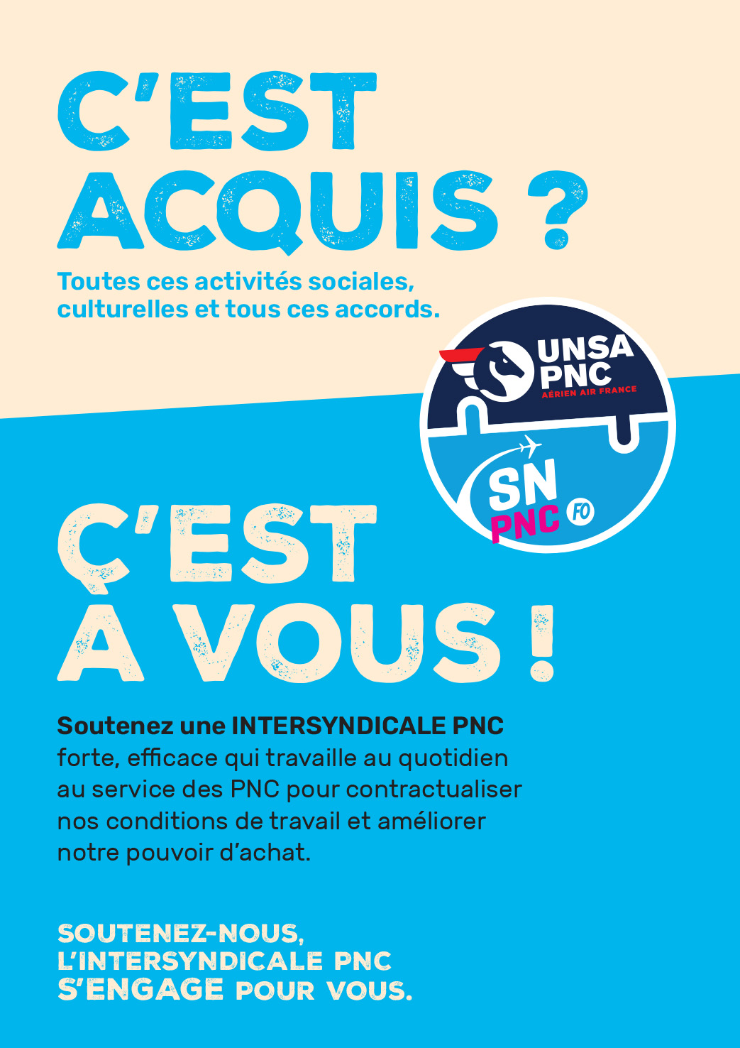 Soutenez une INTERSYNDICALE PNC forte, efficace qui travaille au quotidien au service des PNC pour contractualiser nos conditions de travail et améliorer notre pouvoir d’achat.