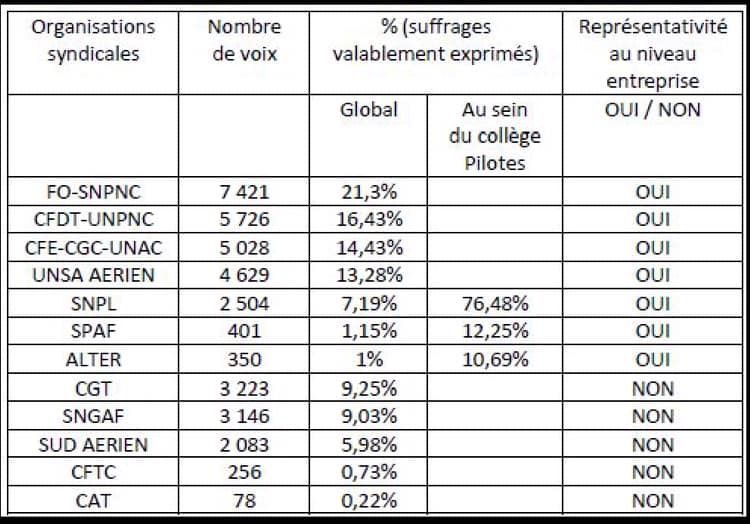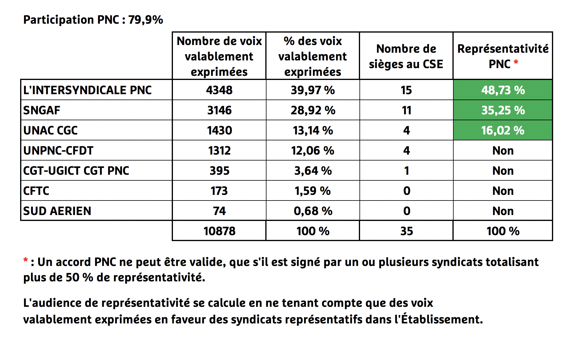 - L’INTERSYNDICALE PNC recueille 39,97% des suffrages et obtient 15 sièges titulaires au CSE sur 35. Le SNPNC-FO et l’UNSA-PNC demeurent donc représentatifs et incontournables dans la négociation pour les 4 années qui viennent.