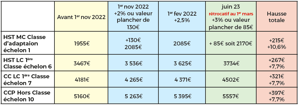 • +3% d’Augmentation Générale* (AG) avec une valeur plancher à 85€ (bruts) avec effet rétroactif au 1er mars payé fin juin.