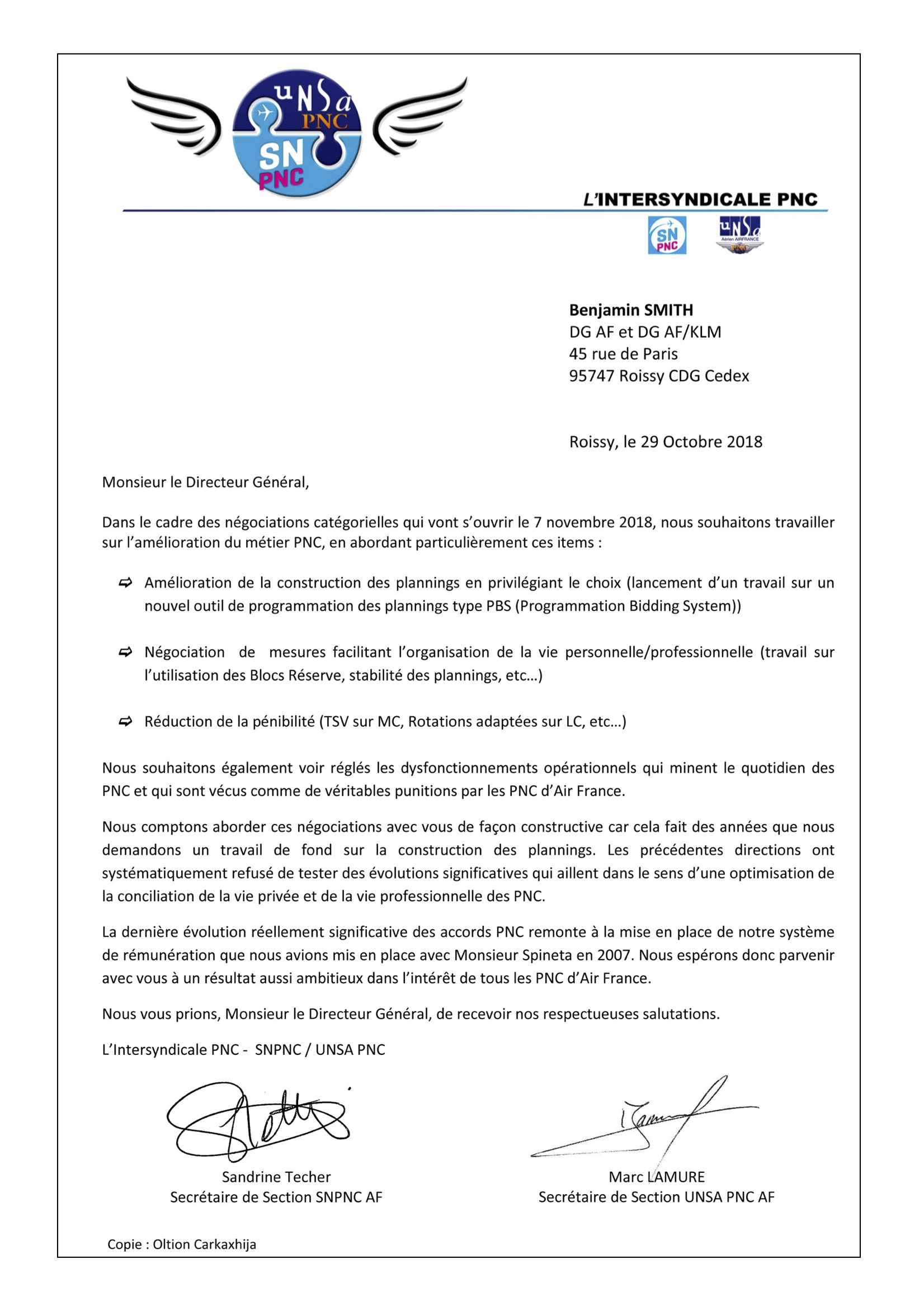 Vous trouverez ci-joint le courrier que nous avons adressé à Benjamin Smith à l’occasion de la négociation qui va s’ouvrir.