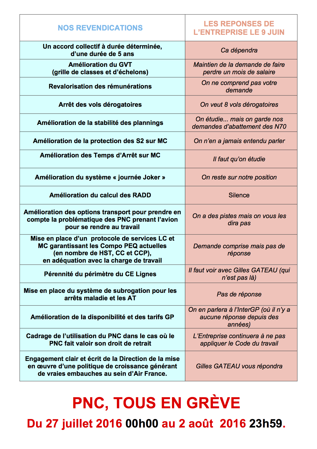 La 7ème réunion de négociation s’est tenue ce jeudi 9 juin. Précisons pour ceux qui l’ignorent que l’Intersyndicale PNC a déposé un préavis de grève pour la période du 27 juillet au 2 août 2016. Etaient présents pour la Direction Mmes DUPIRE et VIVREUX, MM. DAHER, SEDENT, BARGETON, BREDA et THIBAUDON, chacune des trois Organisations syndicales représentatives étant composée d’une délégation de six Délégués syndicaux. Nous sommes toujours privés de M. GATEAU (les négociateurs PNC étant au même régime que les équipages PNC). Une question se pose : le DGA RH et Politique sociale d’AF étant absent depuis cinq réunions, la Compagnie doit–elle lui retirer 5/30èmes de salaire ?