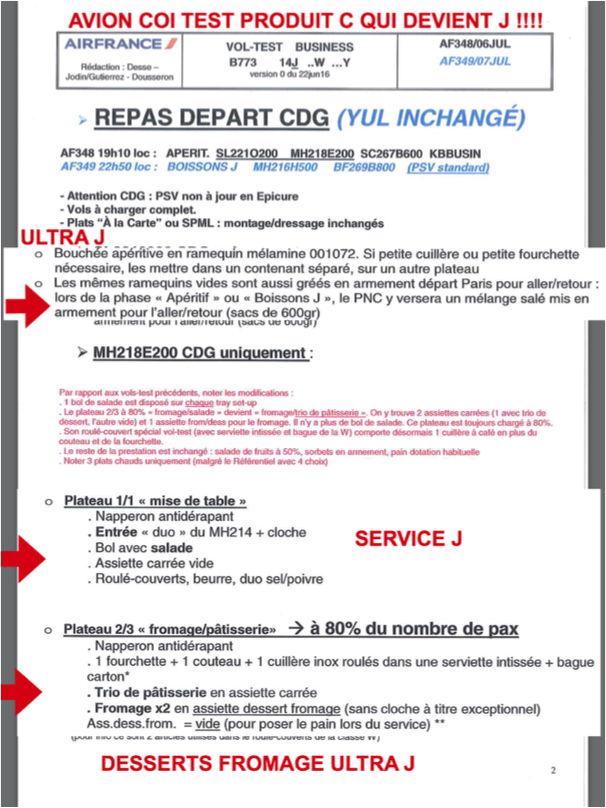 Mises en bouche. Eléments salés apéritifs en vrac de type ultra J que le PNC doit préparer au Galley. Entrée comme en J. Plat chaud comme en J. Pain chaud comme en J. Fromage J et desserts J à choisir par le passager et à monter sur un plateau par le PNC en cabine. Quelle est la différence avec le produit J ? Aucune, ah si ! On perd un PNC et sur les cabines de 30 pax le CCP sera de la partie.