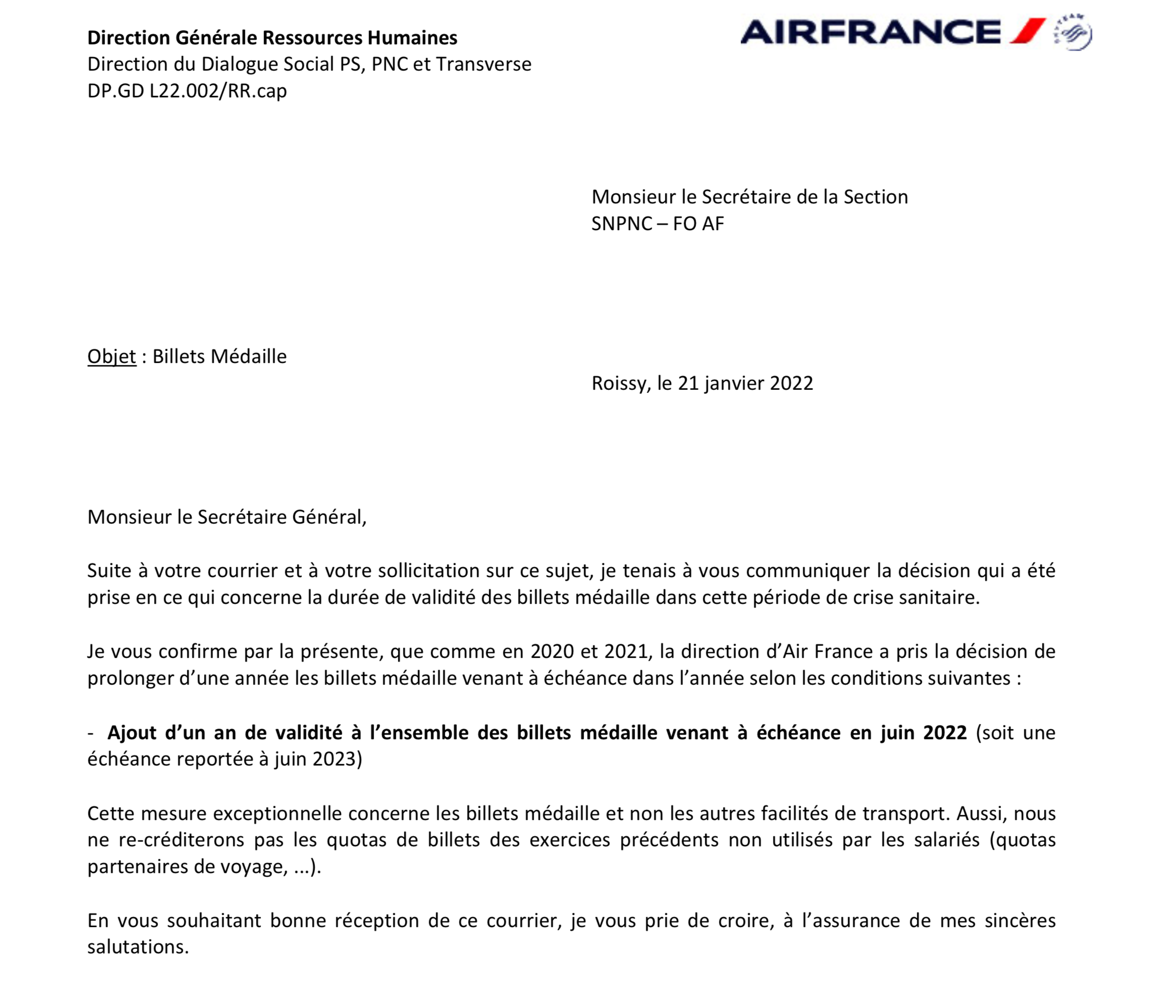 Prolongation validité billets médaille : réponse positive de la Direction à notre demande . « Ajout d'un an de validité à l'ensemble des billets médaille venant à échéance en juin 2022 (soit une échéance reportée à juin 2023) ».