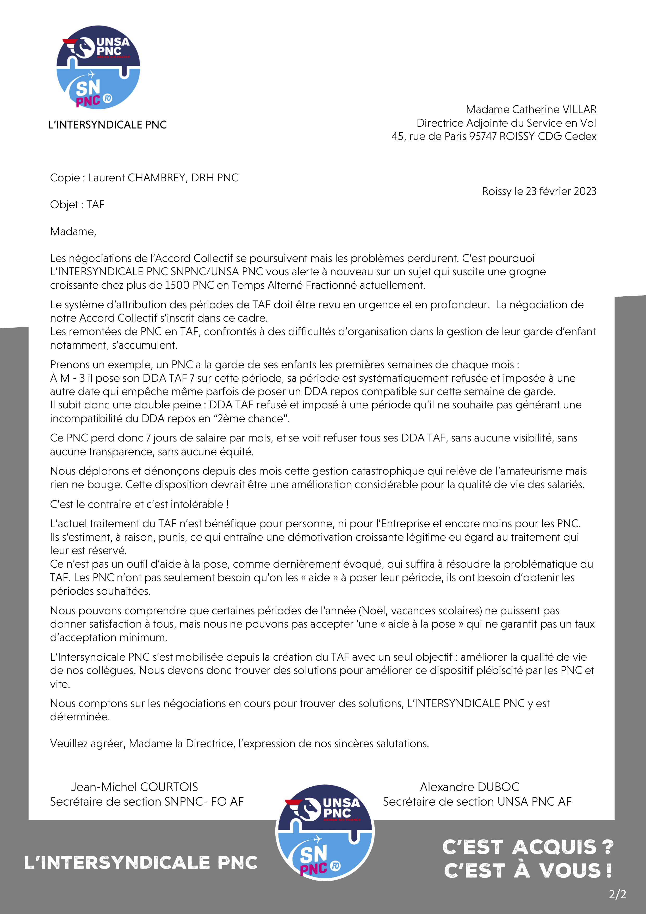 Depuis des années, L’INTERSYNDICALE PNC SNPNC-FO / UNSA PNC dénonce dans les différentes instances les difficultés que vous rencontrez dans la pose de votre TAF. Les périodes demandées sont rarement satisfaites, elles sont la plupart du temps imposées et percutent les autres choix de DDA.