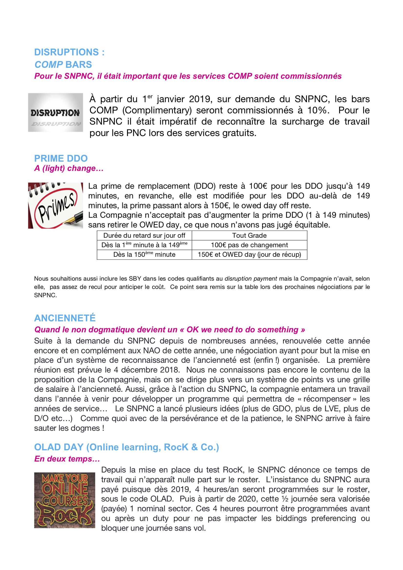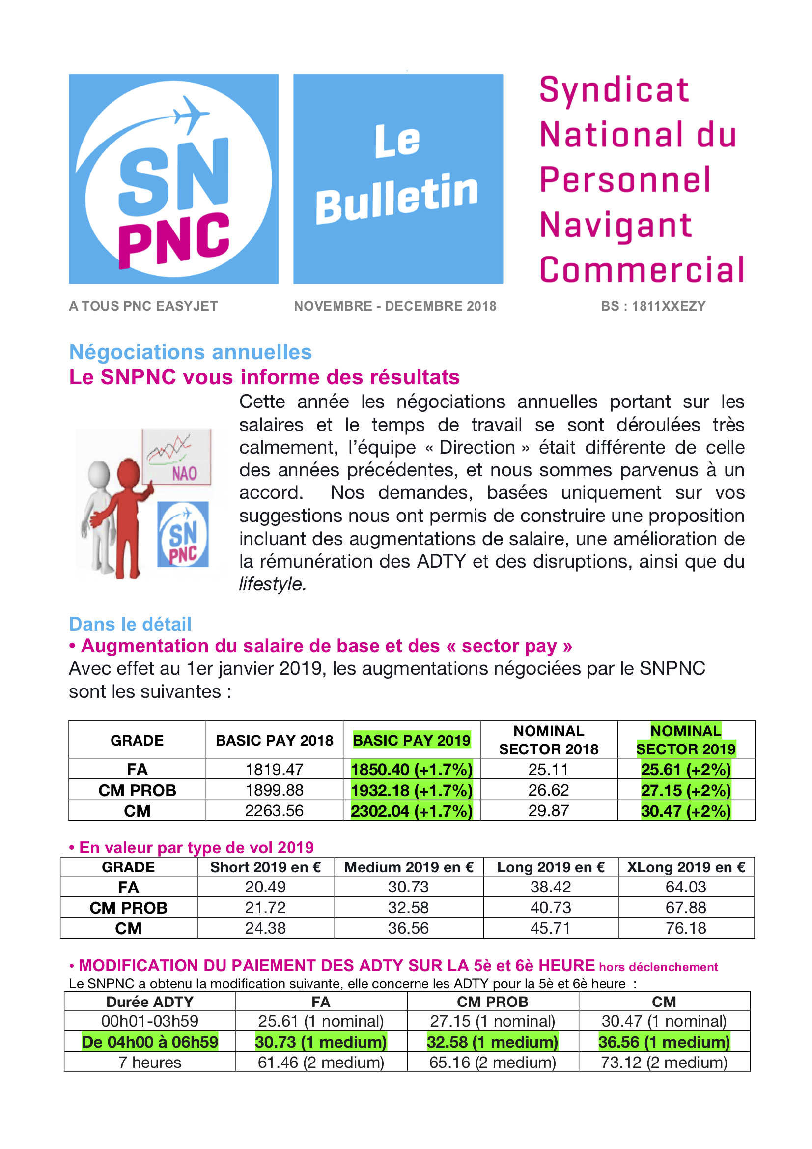 Cette année les négociations annuelles portant sur les salaires et le temps de travail se sont déroulées très calmement, l’équipe « Direction » était différente de celle des années précédentes, et nous sommes parvenus à un accord. Nos demandes, basées uniquement sur vos suggestions nous ont permis de construire une proposition incluant des augmentations de salaire, une amélioration de la rémunération des ADTY et des disruptions, ainsi que du lifestyle.