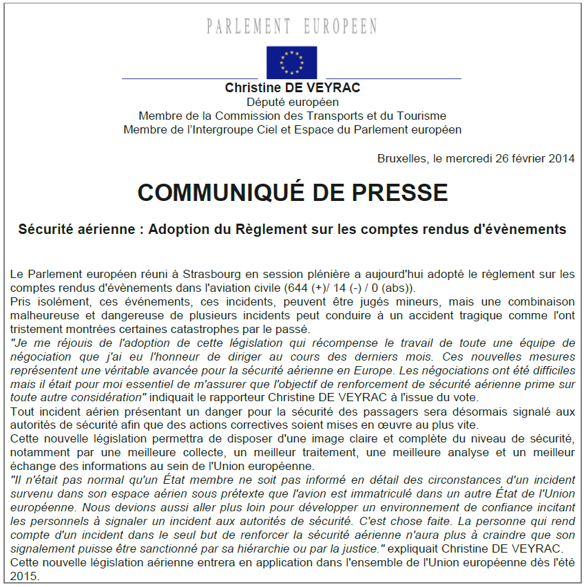 Le SNPNC-FO apporte son soutien sans réserve à la position défendue ce jour en session plénière par Christine DE VEYRAC et portant sur les comptes-rendus d’évènements dans l’aviation civile. Le SNPNC soutient donc le vote favorable du Parlement européen.