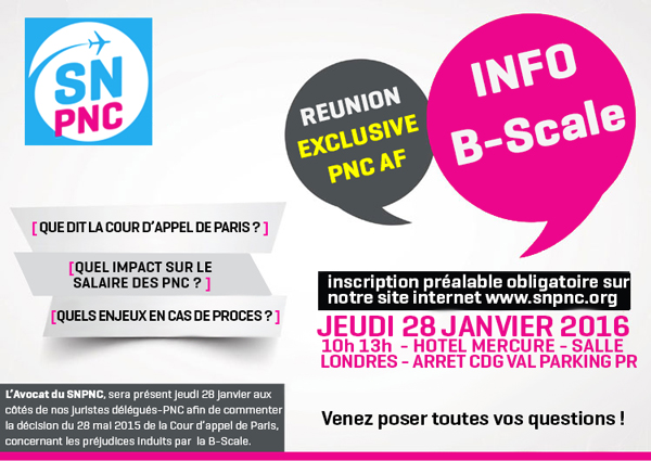 Devant l'afflux de demandes de participants à la réunion d'information B-Scale le 28 janvier 2016, nous avons décidé d'augmenter la capassité de notre salle. La réunion se tiendra dans la salle LONDRES au RDC de l'Hôtel Mercure (CDG VAL arrêt PR). Nous sommes également amenés à demander à chaque PNC qui souhaite être présent, de s'inscrire via le formulaire ci-joint.