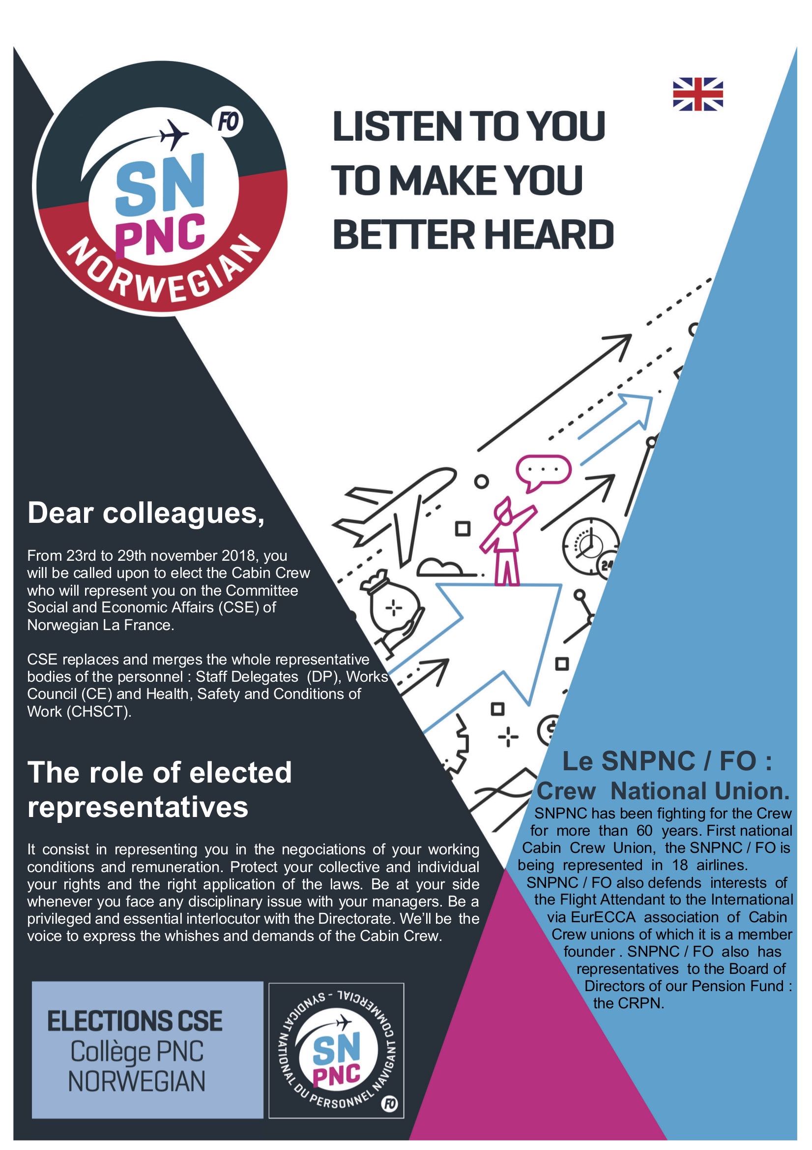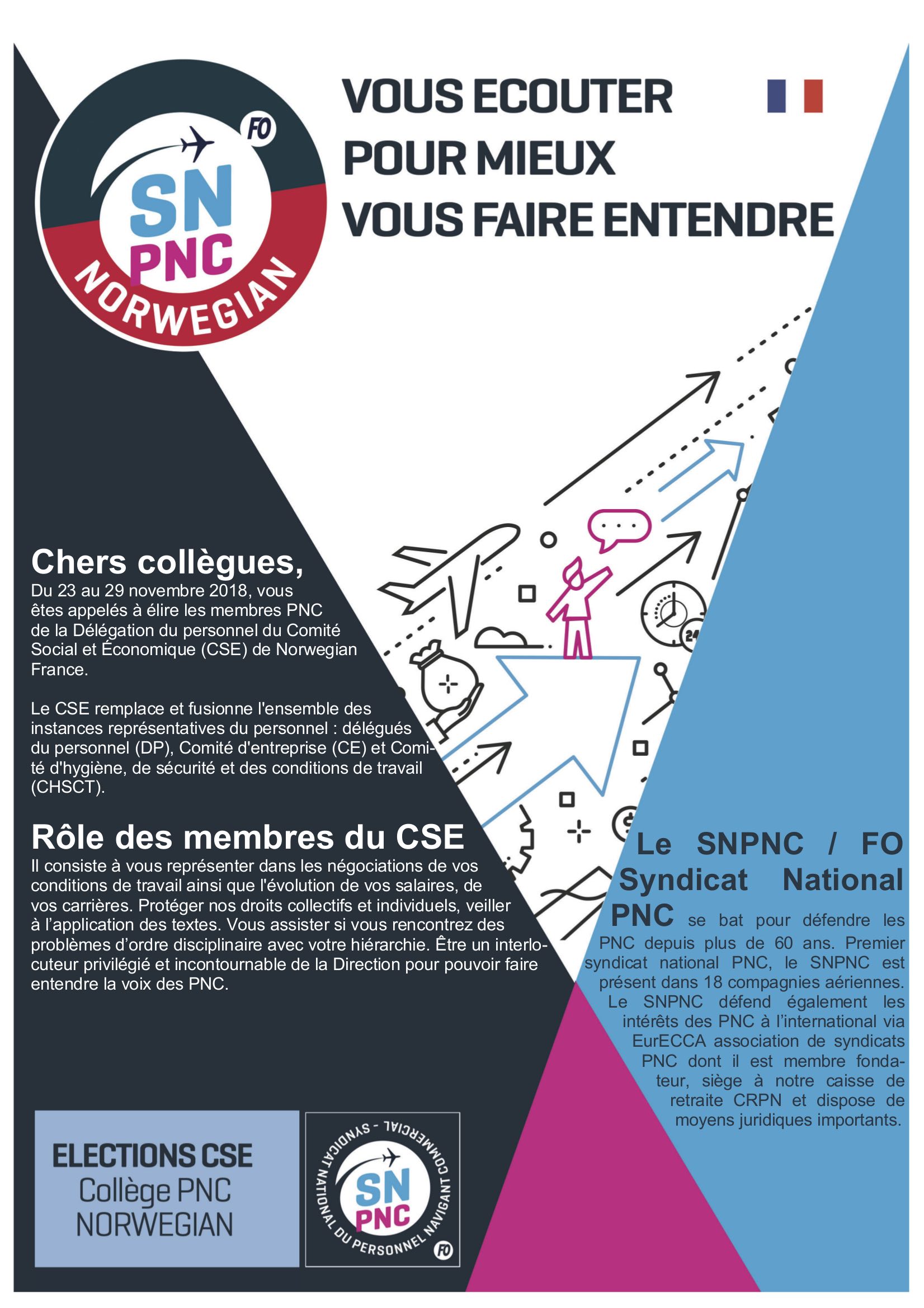 Du 23 au 29 novembre 2018, vous êtes appelés à élire les membres PNC de la Délégation du personnel du Comité Social et Economique (CSE) de Norwegian. Le CSE remplace et fusionne l'ensemble des instances représentatives du personnel : délégués du personnel (DP), Comité d'entreprise (CE) et Comité d'hygiène, de sécurité et des conditions de travail (CHSCT). Le vote est bien sur anonyme et votre participation massive à ce scrutin légitimera notre action et nous permettra de vous représenter avec d'autant plus de poids.