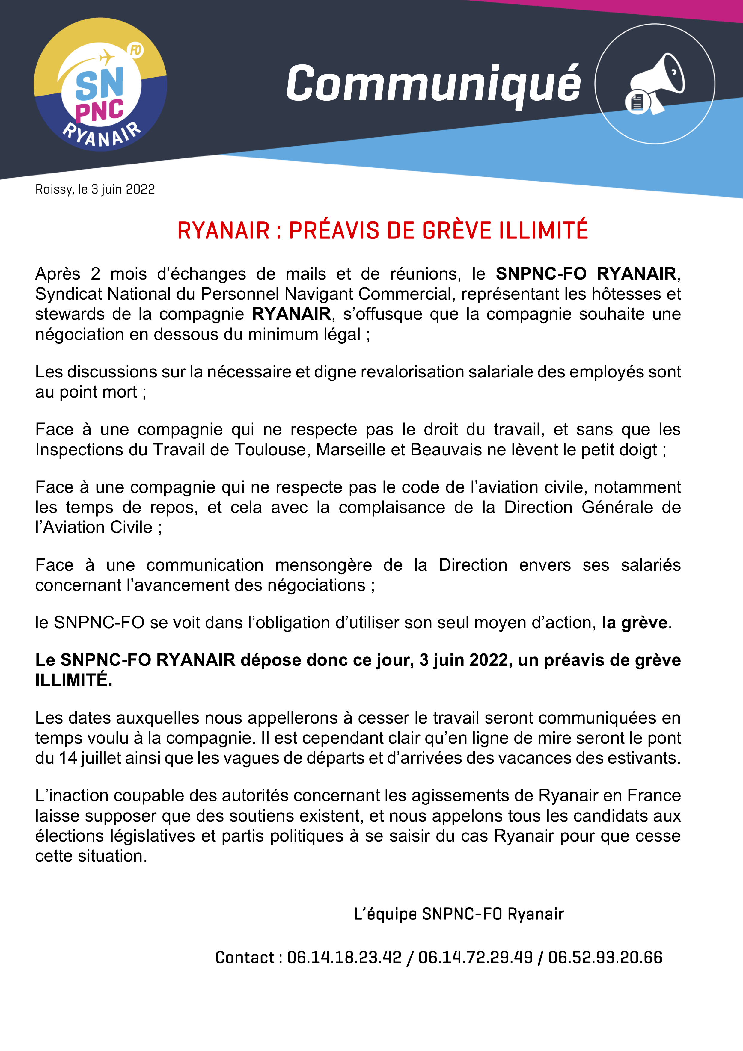 Le SNPNC-FO RYANAIR dépose donc ce jour, 3 juin 2022, un préavis de grève ILLIMITÉ.