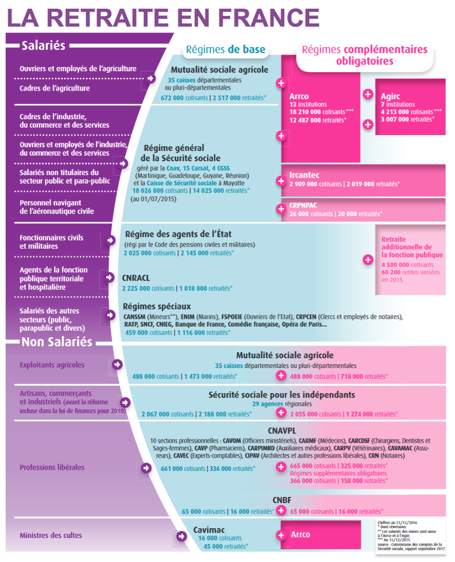 Aujourd'hui, la retraite obligatoire comporte essentiellement deux composantes : la retraite de base et la retraite complémentaire. Tous les régimes ont un point commun : ils sont fondés sur un principe de répartition (par opposition à la capitalisation ou provisionnement). Cela signifie que les cotisations versées par les actifs chaque année sont immédiatement utilisées pour financer les pensions des retraités.