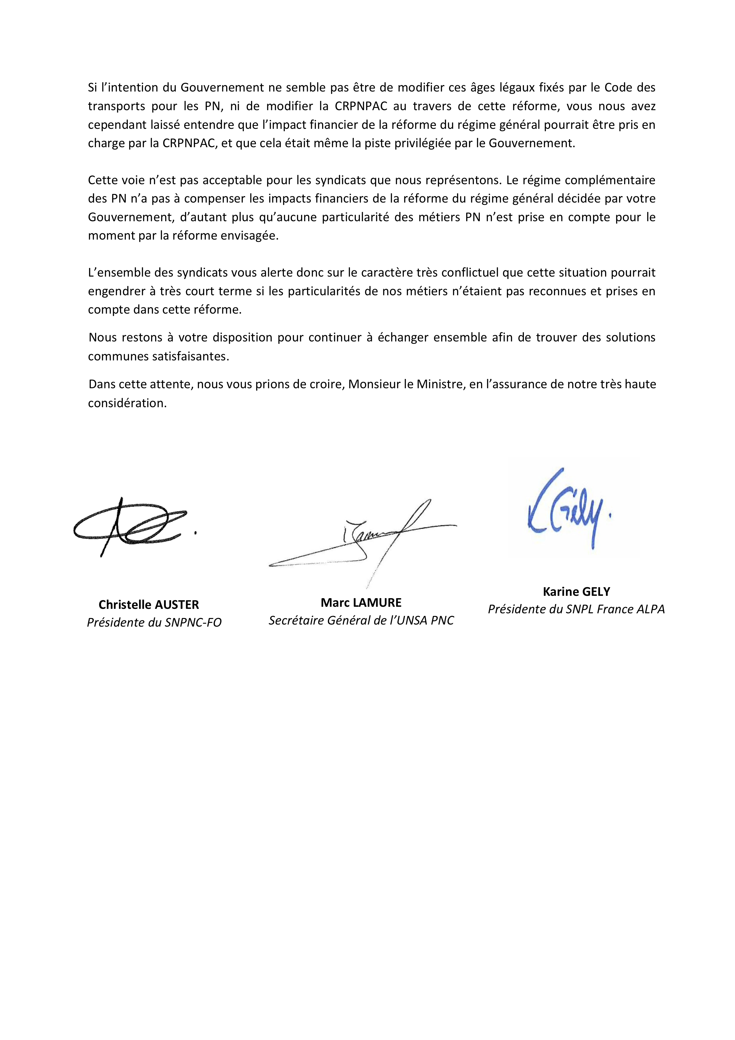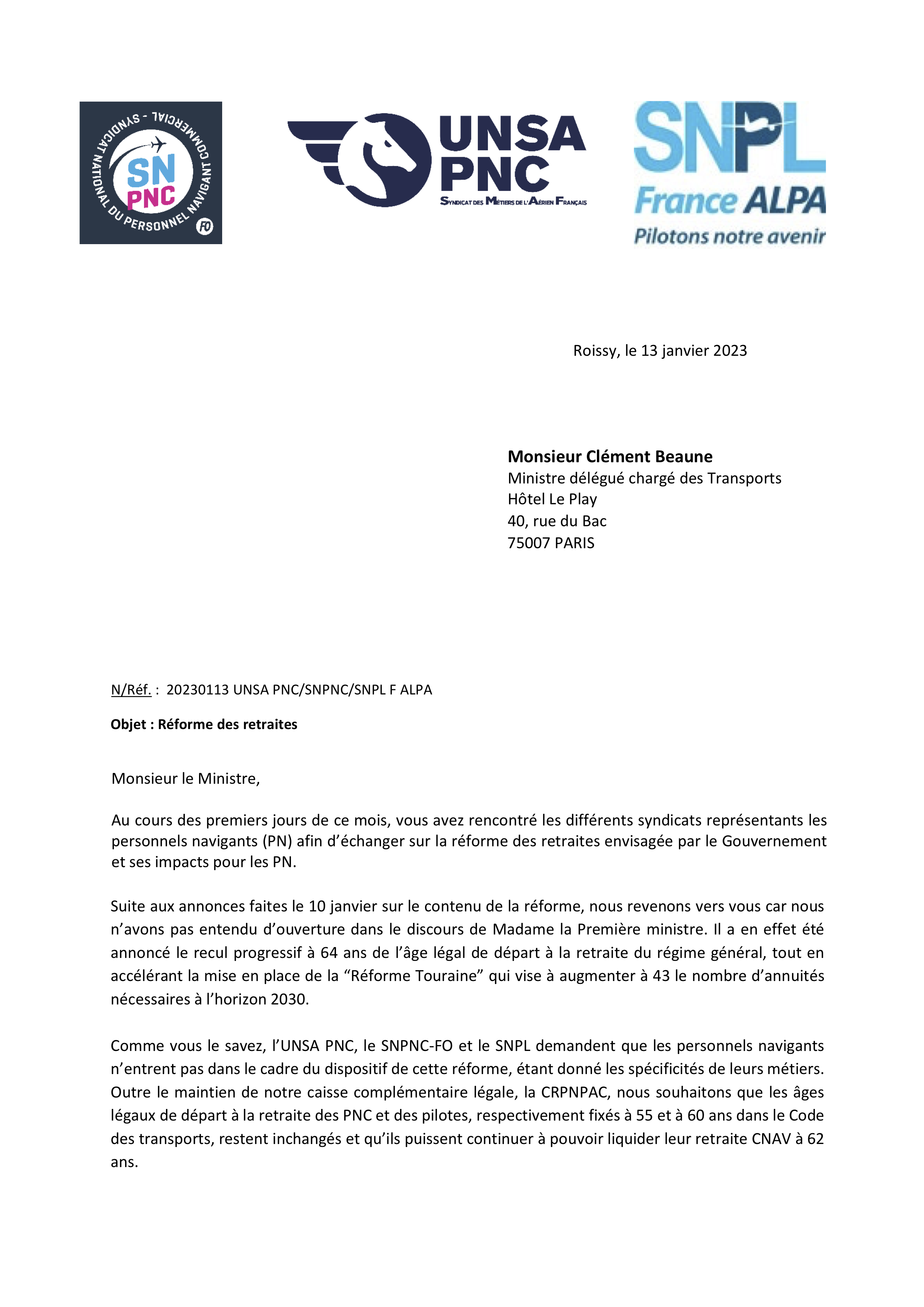 Le SNPL, le SNPNC-FO et l'UNSA PNC refusent l'âge de la retraite à 64 ans pour les PN. Ci dessous le courrier envoyé au Ministre délégué chargé des Transports :