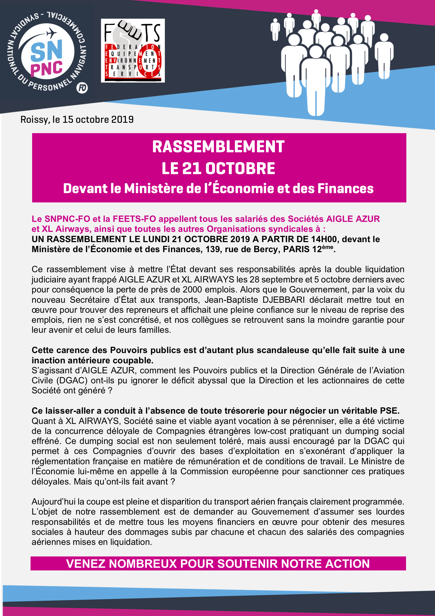 Le SNPNC-FO et la FEETS-FO appellent tous les salariés des Sociétés AIGLE AZUR et XL Airways, ainsi que toutes les autres Organisations syndicales à :